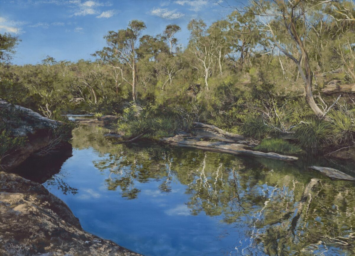 The surface of the river is always shifting, with reflections that move and change in mesmerizing patterns, catching the summer light of the Australian bush. The Potholes Reserve and Bargo River, Tahmoor, are places I often return to. This painting invites quiet reflection and a gentle moment of calm.