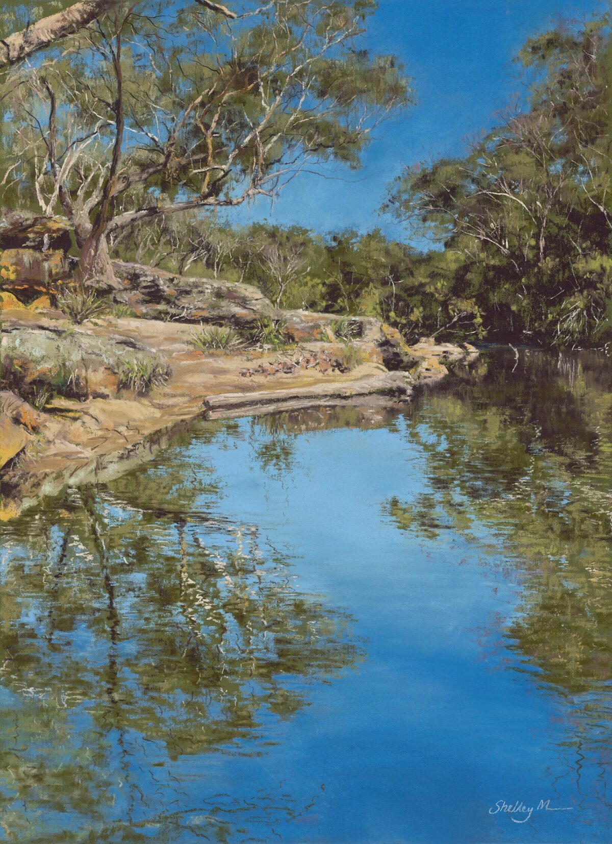 soft pastel 43.5 x 31.5 cm - image size 64.5 x 52.5 cm - framed The surface of the river is always shifting, with reflections that move and change in mesmerizing patterns, catching the summer light of the Australian bush. The Potholes Reserve and Bargo River, Tahmoor, are places I often return to. This painting invites quiet reflection and a gentle moment of calm.