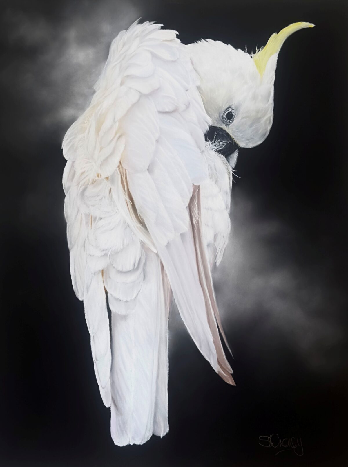Sforzando denotes a sudden, emphatic musical accent, a note that insists on being heard. In this painting, the emphasis is translated visually through extreme contrast and isolation. The cockatoo, poised and self-contained, stands almost monument-like against the void. Despite the species’ reputation for raucous sound, this work considers another form of intensity: the power of contained presence. Silence can be confrontational. Silence becomes the loudest response.
