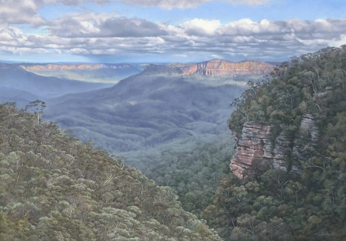This view towards Pulpit Rock Lookout was inspired by a late afternoon walk at Govetts Leap near Blackheath in the Blue Mountains. As the sun lowered, deep blue shadows moved across the cliffs and tree canopy, hiding details in mystery and shifting the mood of the landscape.