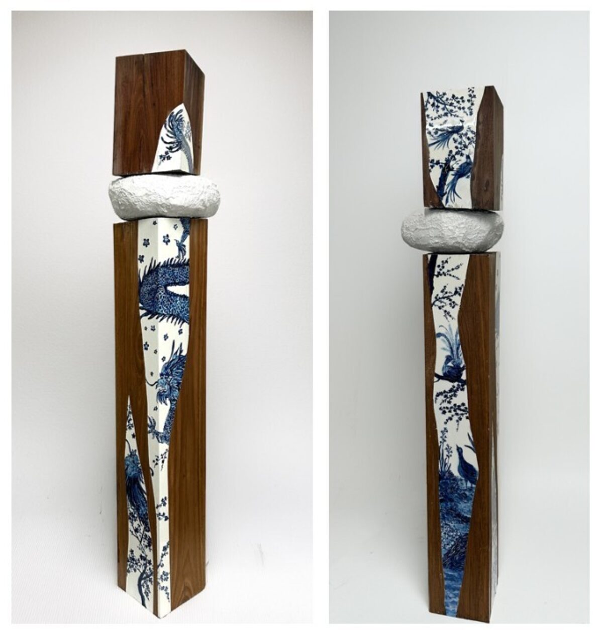 mixed media sculpture - wood, resin and acrylic paint H: 130 cm W: 25 cm D: 24 cm The grain remembers. Painted with birds and dragons, each figure carries movement and life, inviting viewers to reflect on the stories, myths, and quiet histories that wood preserves, bridging past and present, earth and sky.